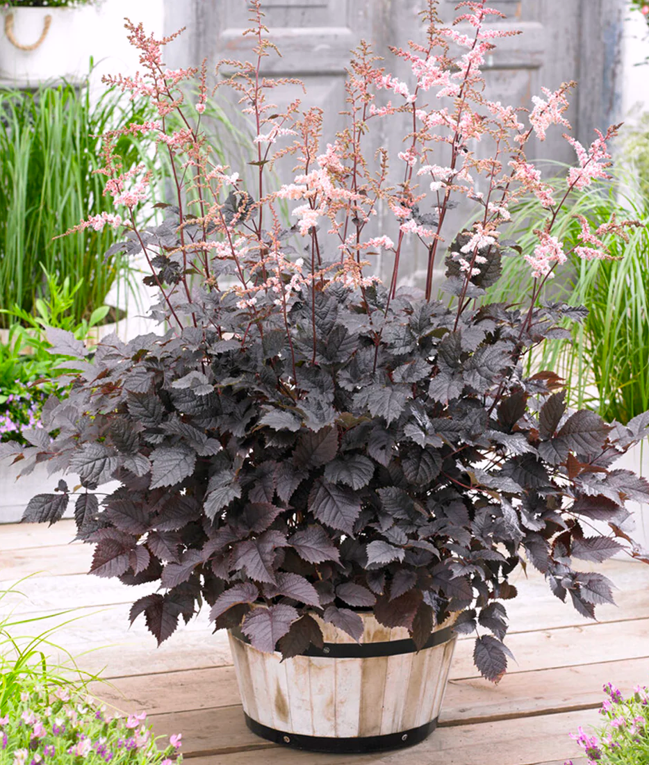 Also known as: Chocolate Shogun False Goat's Beard, Chocolate Shogun False Buck's Beard, Black False Goat's Beard, Black Garden Astilbe, Black False Spirea Astilbe, Dark Leaf Astilbe, Blush Pink Astilbe