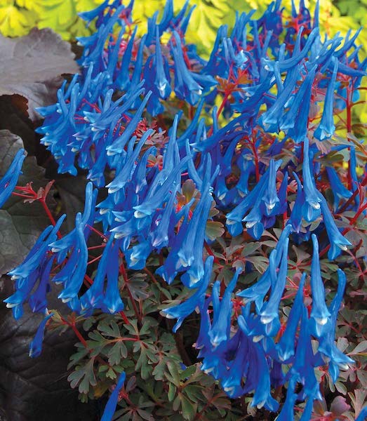Blue Heron Corydalis is known for its striking sapphire blue, long, tubular flowers. Its masses of fragrant flower spikes on showy, red, upright stems, create an astonishing contrast to its highly divided, bluish-green foliage. You need to see a Blue Corydalis in order to fully appreciate the beauty of its colour.