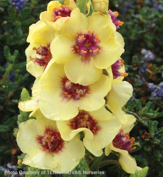 Dark Eyes Mullein is a stunning, sunny, short perennial with spikes of creamy yellow flowers accented with deep red-maroon centres, which attract hummingbirds. A compact plant with 8 inch, dense rosettes of large, crinkly green leaves, and 12 inch spikes of flowers, it thrives in a sun-filled location. (Does not like wet locations and requires good drainage.) A long bloomer – expect flowers from June to August. Use Verbascum 'Dark Eyes' in rock gardens, and the front of sunny borders. Wonderful thriller for bouquets of summer flowers.