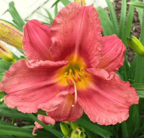 Hemerocallis 'Rosy Returns', commonly known as Rosy Returns Daylily has fragrant, 4 inch, rosy blooms with a ruffled edge, a deep rose eye, and a yellow throat. At 14 inches tall, and with 9 -12 buds per stem, and a blooming period from June to October, Rosy Returns Daylily makes a wonderful ground cover, and mass planting flower for beds and borders. An award winner, it is unusually hardy for a pink Daylily. Considered the first hardy rose pink everblooming daylily.