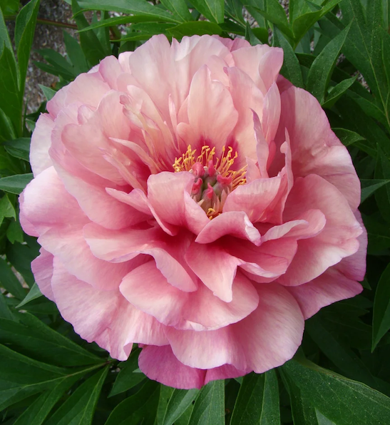 A stunning Peony, Garden Candy® Double Bubble Pink™ Itoh Peony has exceptionally large blooms (4 inches in diameter) of creamy pink with yellow stamens. A robust cross between an herbaceous peony and a tree peony, this pink-salmon peony's flowers are held close to the foliage, creating a compact, rounded form that requires no staking; and most notably, has mildew-resistant foliage. Abundant blooms in June - July. Foliage stays attractive all season long – turning maroon in the fall.