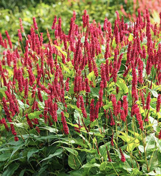 Red Bistort is a tall, robust, floriferous clumping perennial with stunning, carmine red to pink bottle-brush flower spikes on tall stems. Growing to 4 ft tall, it blooms from July to October. Has oval / heart-shaped green foliage that takes on yellow-orange hues in autumn. Although also known as Mountain Fleece and Ornamental Knotweed, Persicaria amplexicaulis 'Speciosa' is vigorous, but not invasive. It is not related to the invasive Japanese knotweed.