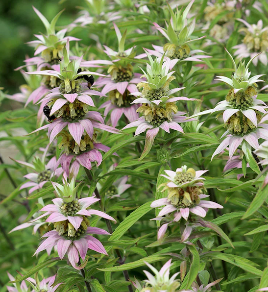 Beebop Spotted Bee Balm (Horsemint) is a unique and stunning bee balm variety with speckled, yellow-white blossoms and large, lance-shaped pink and silver-pink bracts that are whorled around 24 inch stems. A compact, early blooming bee balm with green, very fragrant foliage (that makes a lovely tea) that forms a rounded mound and serves as the backdrop for its surprising flowers. A heavy bloomer, it attracts many native pollinators - hummingbirds, butterflies, and bees to the garden.