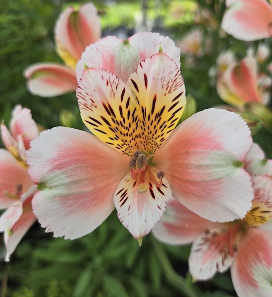 Jean Alstroemeria (Alstroemeria DUKES 'Jean') has magnificent multicoloured blooms, with shades of pink, salmon, orange and yellow surrounded by creamy white, enhanced with contrasting stripes of brown and hints of green along the edges. This white-peach Alstroemeria seedling is one of the most attractive members of the Duc D'Anjou hybrid series.